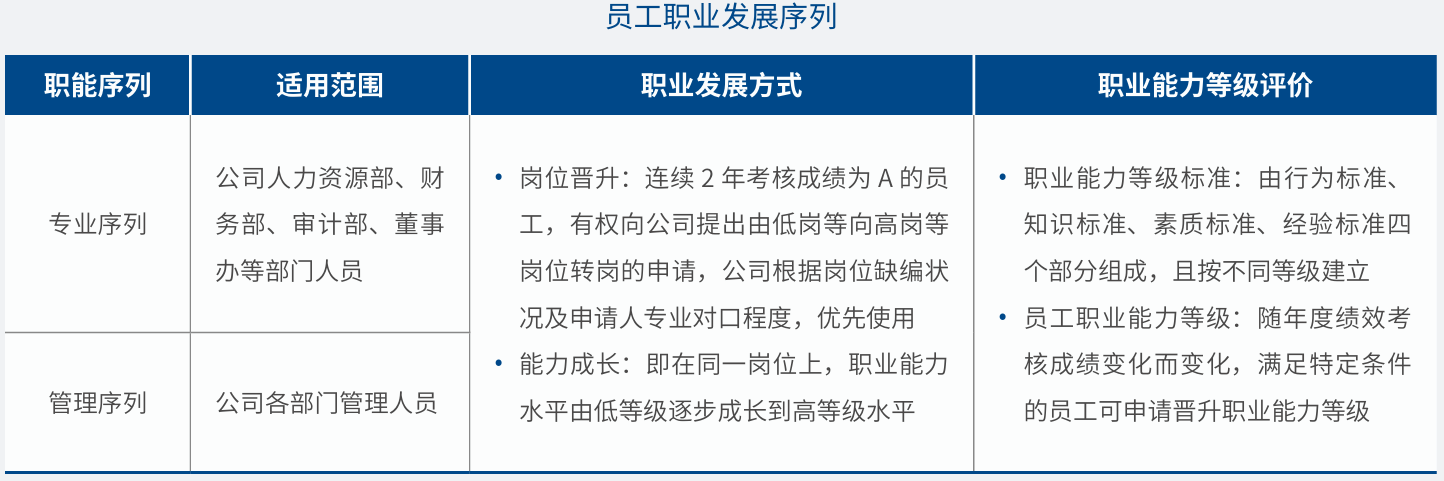 薪酬和绩效管理:公司依据《薪酬管理办法》《高级管理人员薪酬绩效管理办法》,制定了年薪工资制、岗位能效制、特区工资制三种薪酬结构。我们在职位分类、评估和能效管理的基础上,根据岗位的相对价值和任职者胜任能力、能效表现支付薪酬,并根据美世国际职位评估法,规范、客观、全面地进行员工绩效考核,绩效考核结果将被应用至薪酬调整、绩效奖金、晋升与发展等场景。