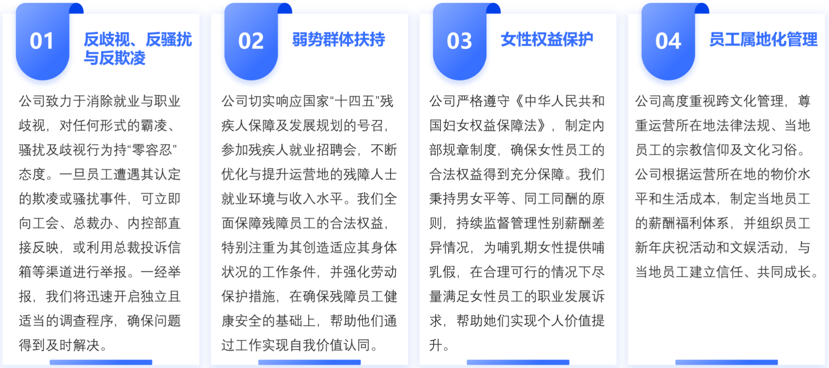 我们严格遵循运营地雇佣和劳工权益相关法规,结合企业战略和业务需求,持续优化合规雇佣管理机制,拓展人才招聘渠道。同时制定并完善员工职业发展管理制度与薪酬福利体系,提供多元化的民主沟通渠道,以激发员工工作热情,增强企业凝聚力。